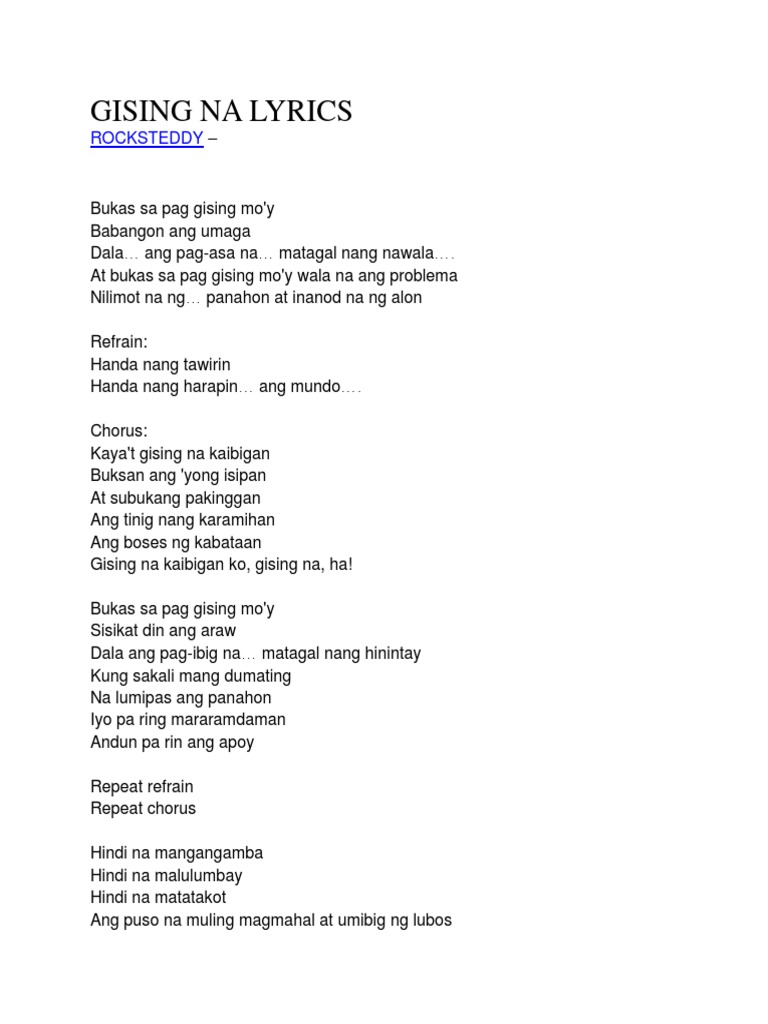 Nagawa mo na ba ang mga bagay na dapat mong ginawa. May mga taong bulag kahit dilat ang mata. CHORUS Gising na kaibigan ko Ganda ng buhay ay nasa sa yo Ang oras daw ay ginto Kinakalawang lang pag.